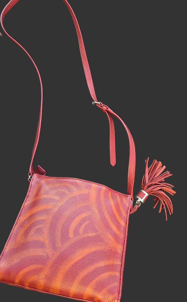This purse is a one-of-a-kind statement piece, hand-painted with intricate tribal designs and sealed for lasting quality. Multiple pockets, including a spacious main compartment and a separate zipper compartment, this purse effortlessly combines fashion and functionality. Measuring approximately 14" wide and 12" high, it is the perfect accessory for any fashion-forward individual. This gently used purse has been created into another level of art!